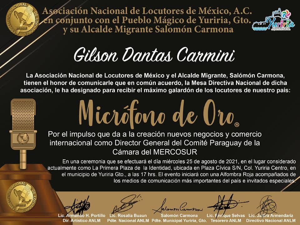 Por el impulso que da la creacion nuevos negócios y comercio internacional como Director General del Comité Paraguay de la Cámara del Indústria y Comercio do Mercosur e Américas, Sr. Gilson Dantas Carmini.