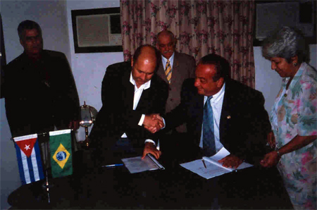 O Presidente da Câmara de Com.Mercosul e Américas assinando acordo de cooperação com o Vice-Ministro Eng. Ibrahim Nápoles Albanês do Ministério de La Industria Sidero Mecânica (Cuba).