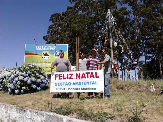 Os alunos das turmas do curso de Gestão Ambiental da UFPel em Pinheiro Machado montaram uma árvore de Natal toda enfeitada com lixo doméstico.