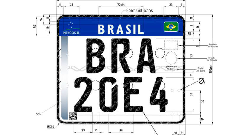 As novas placas terão fundo branco, quatro letras e três números. A margem superior será azul e terá o emblema do Mercosul à esquerda. No centro, ficará o nome do país. As bandeiras nacional, do estado e do município ficarão à direita.