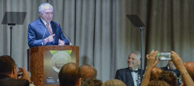 Após receber a homenagem, em sua fala, Michel Temer agradeceu o carinho com que foi recebido e voltou a enumerar as principais realizações de seu governo na área econômica, política e social. Ao citar as estatais, Temer declarou que a Petrobras há 4 anos atrás estava desmoralizada no nacional e no plano internacional, hoje ela voltou a ser um orgulho nacional; a Eletrobras, a Infraero, todas elas davam prejuízo no passado, agora dão lucro. O Presidente da República ainda falou sobre a retomada do emprego: incentivamos muitos setores, entre eles o da construção civil, que é o que mais emprega no nosso País. Segundo o homenageado, a construção civil, assim como a indústria, reúne dois setores produtivos do País: o empresariado, de um lado, e os trabalhadores de outro lado, e a modernização trabalhista trouxe precisamente a redução do desemprego.