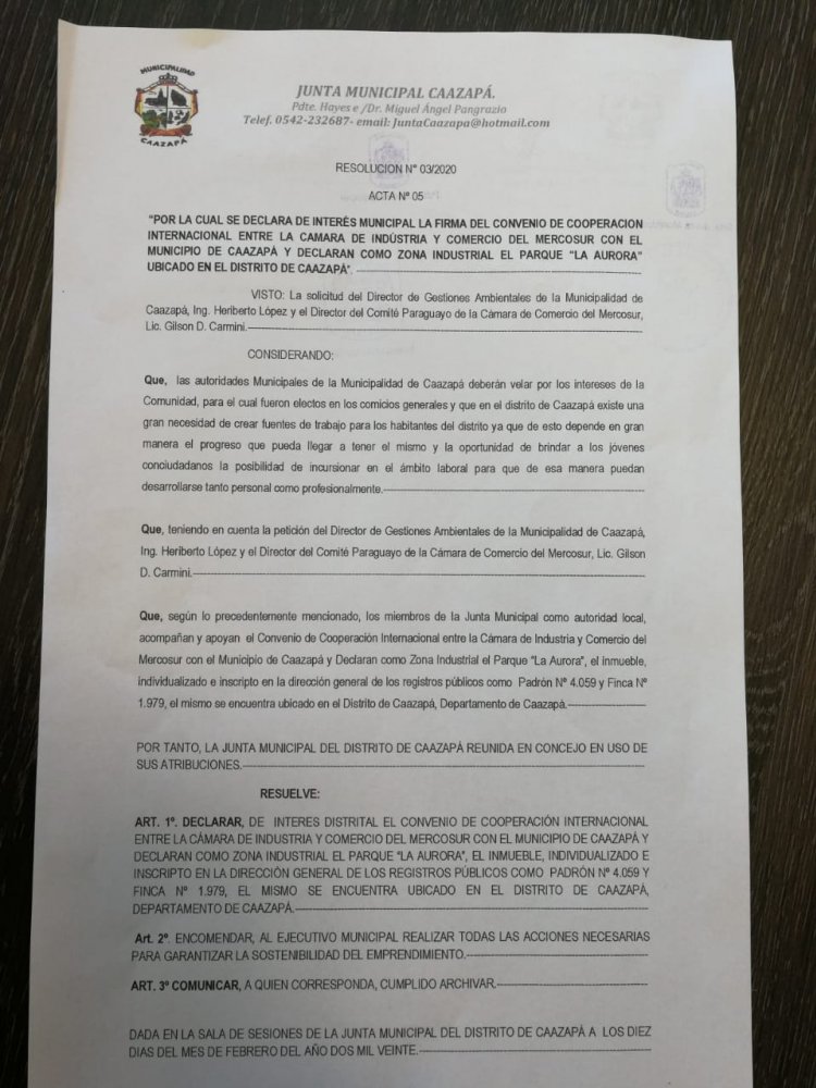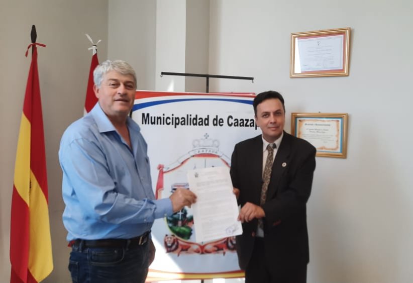 El motivo de la reunión fue para promover la firma del convenio de cooperación internacional entre la municipalidad de Caazapá y la Cámara de Industria y Comercio del Mercosur, que en el mes de marzo recibirá nuevamente la visita del presidente Lic. Miguel Luján Paletta, para la firma de dicho convenio. El mismo traerá varias empresas para conocer el futuro parque industrial que a través de los convenios firmados con la Gobernación de Caazapá y en su visita será firmado otro convenio también con la Municipalidad de Caazapá estaremos proporcionando todas las garantías, reducción de los impuestos municipales y el reclutamiento de los currículos para el personal que irá trabajar en el futuro parque.